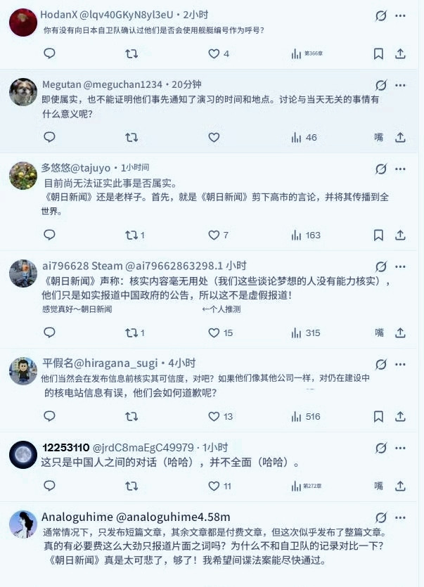 一些网民认为《朝日新闻》站位有问题,没有支持日本军方的说法,因为后者声称虽然收到了训练的通报,但没有说明训练时间和地点。